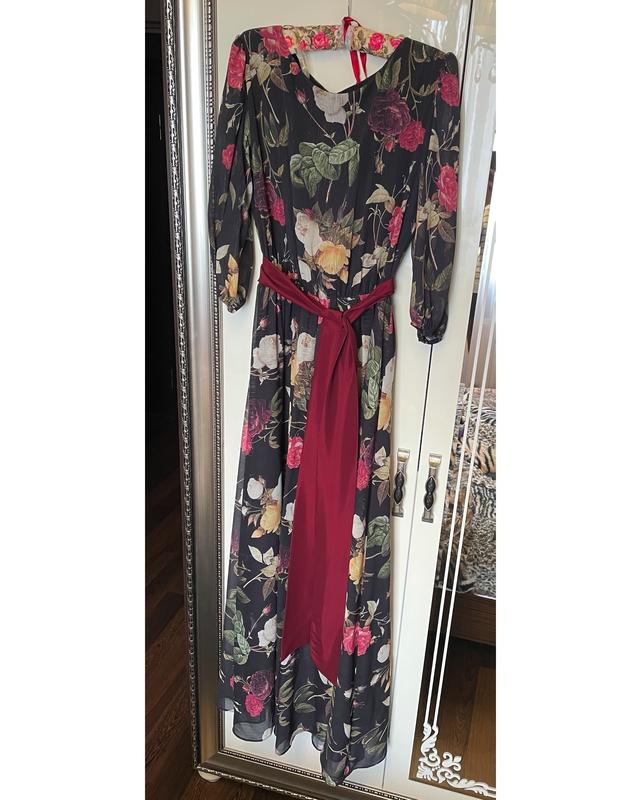 Нарядное платье на торжество 44р , на L-XL подойдёт . На резинке на талии , сверху пояс . На последнем фото можно увидеть как сидит на Xl. Одевалось 2 раза на мероприятия.