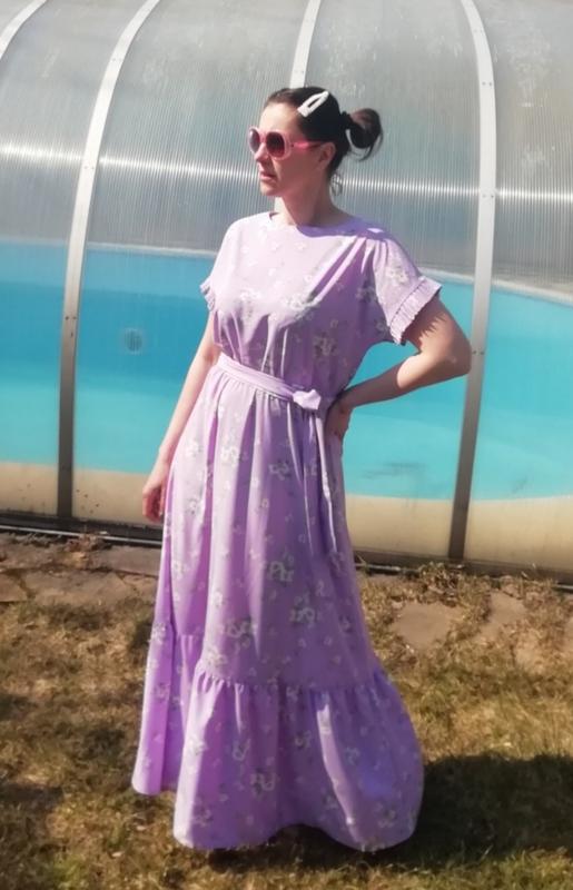 Длинное легкое летнее платье из нежнейшего софта модного цвета "лаванда" в цветочный принт. Спущенный рукав с оригинальной рюшей, на талии на резинке, под пояс (длина 3 м). Материал: софт (еврошифон с вискозой). Не светится.