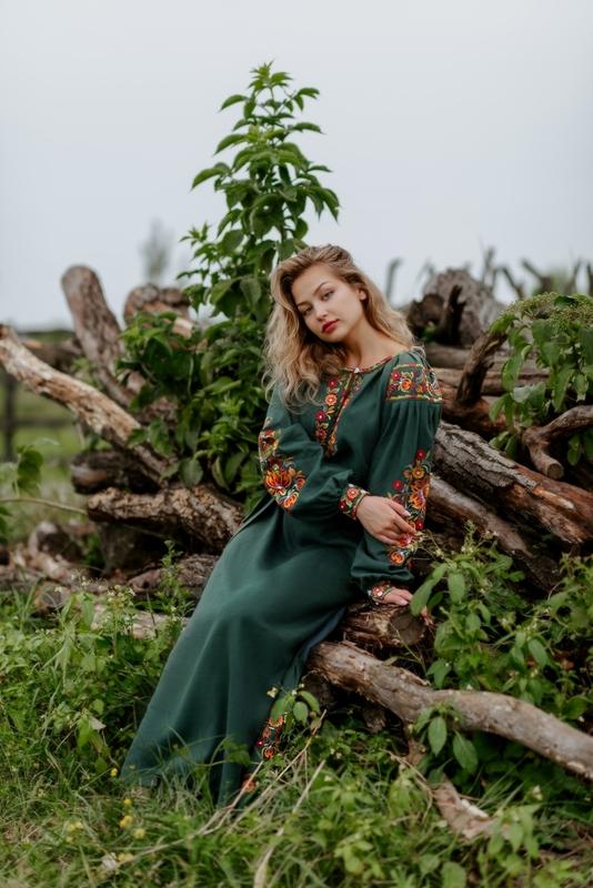 Длинное льняное платье зеленого цвета в стиле петриковской росписи