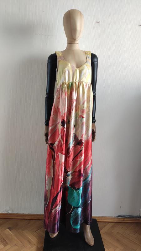 атлас с красивым рисунком тюльпанов сшитое на заказ в ателье. ог 96-100 см с завышенной талией охвад под грудью 86см длина 150см