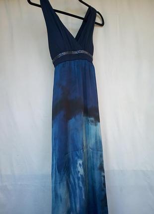 Длинное синее платье с красивым принтом. В районе груди небольшие вставки, можно носить без лифа. Сзади шлейки идут накрест. Линия из страз под грудью. На рост от 1.65 размер M-L.