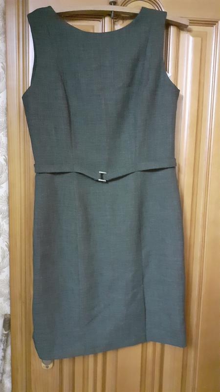 Классическое прямое платье темно- зелёного цвета, спереди пояс обманка, слева внизу разрез 17 см. Сзади змейка 55 см. 100% полиэстер. Длина 94 см. Ширина на месте обманного пояса 41 см.