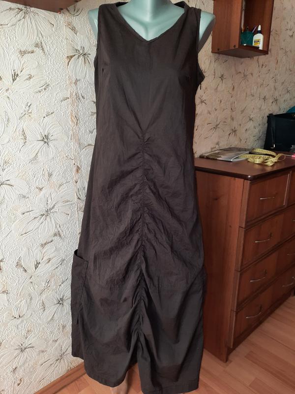 размер на этикетке 2, смотрите замеры. состояние отличное, без дефектов. цвет темный коричневый. ткань тонкая, не тянется, 55% хлопок, 45% полиэстер. есть подкладка, 100% полиэстер. длина от верхней точки плеча к низу 126. п/о груди 50. п/о талии 48. п/о бедер 63. ширина между плечевыми швами 32. 6.