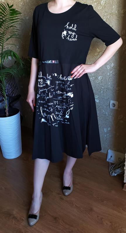 Интересное и стильное платье. Изделие c рукавчиком три четверти. Также модель имеет вставку - пластиковый поясок на талии и модные надписи. Низ изделия имеет небольшой разрез. Верх изделия - трикотаж, низ - коттон. Страна производитель: Турция. Материал: 90% коттон, 10% трикотаж. Размер: 50, 52, 54, 56.