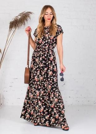 Літній довге( Аліна чорне 102) плаття з легкої тканини з красивими яскравими принтами. Сукня з пояском на талії і завдовжки спідницею в підлогу, виконано з легкої тканини. Верх сукні з цельнокроенными рукавами з напуском по лінії талії, на свободу облягання. Низ сукні А-силуету з внутрішніми кишенями. Пояс на резинці, пояс в тон плаття підкреслить Вашу талію і завершить ідеальний образ. Стиль : романтична. Матеріал: софт Розмір: 44-46, 48-50, 52-54, 56-58. Якщо є в жіночому гардеробі речі, яких ніколи не буває занадто багато, то це, безсумнівно, сукні. Змінюється мода, сезони чергуються між собою, а потреба в нових нарядах не вичерпуються ніколи. Короткі і довгі, однотонні, з принтами і гипюровыми вставками, шифонові, трикотажні, атласні — всіх різновидів суконь не злічити.