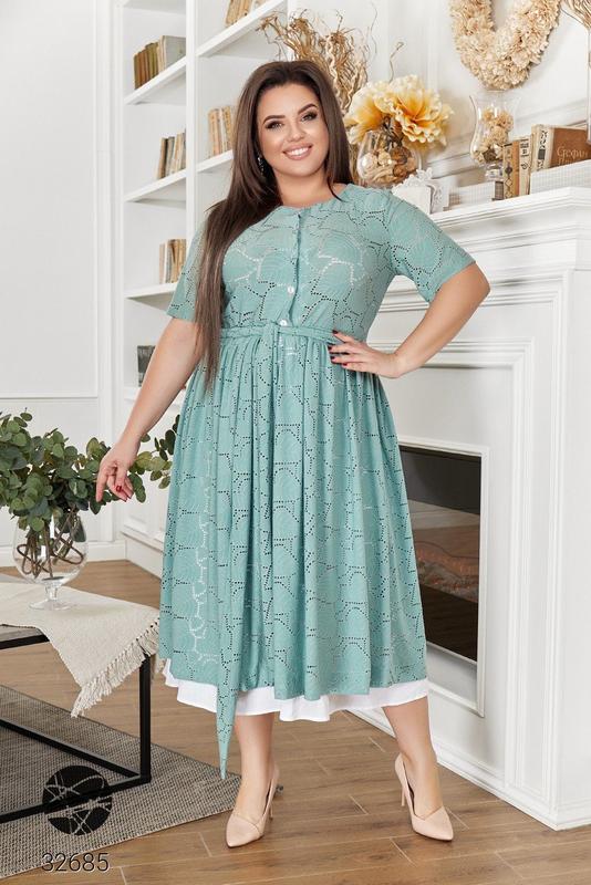 Платье длины миди с перфорацией. Круглый вырез, подкладка, планка на пуговицах. В комплекте пояс.