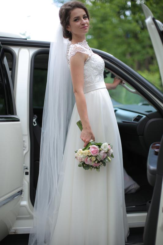 Платье шилось под заказ, по моим меркам: 82-62-90, рост 166 см, под каблук 7 см. {В груди может быть разлёт до 10 см, талия - 2-3 см, если по Вашим меркам}. Корсет на молнии, спинка - пуговки. Верх - кружево, юбка - лёгкий фатин. Фатин сел после химчистки, замена в салоне стоит 1800 грн. Поэтому такая цена. Либо же подойдёт на девушку ростом около 150 см, тогда просто можно укоротить и фатин менять не придётся.