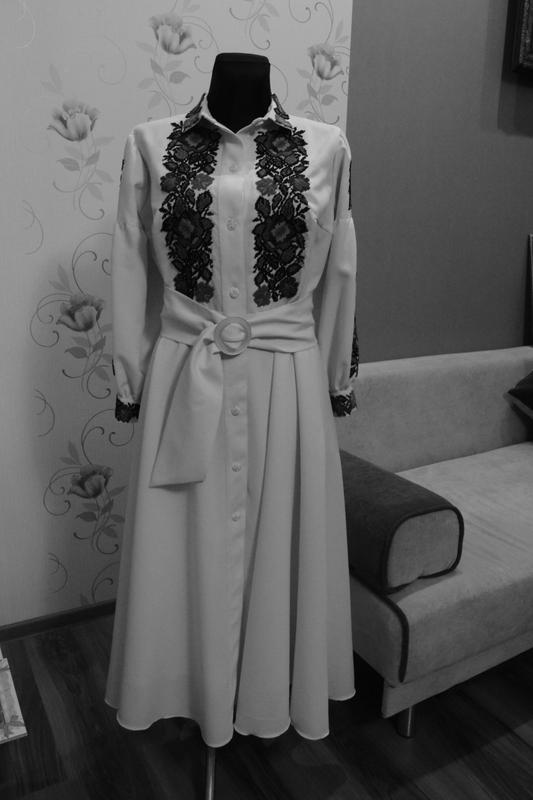Плаття вишите бісером. Ручна робота по типу бохо, на гудзиках. Має комірець. Талія регулюється поясом. Оригінальний орнамент. Тканина - - габардин - еліт. Має підкладку. ПОГ--53, ПОТ--45, бедра вільно. Довжина - - 130, довжина рукава--57см.
