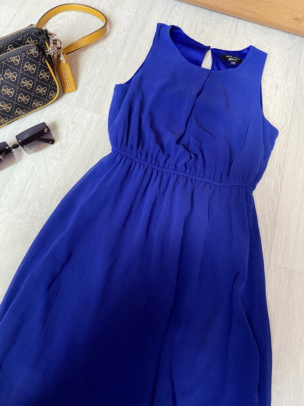 Красивое синее платье, спереди коротенькое, сзади длиннее. Есть подкладка.