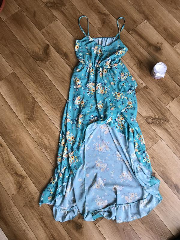 Заміри: довжина 117 см, пів обхват грудей 37 см, пів обхват талії (на резинці) 29 см Дуже красива сукня, ззаді подовжена, а спереді вкорочена, немов на запах, з підкладкою всередині
