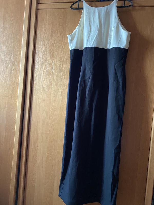 Длинное вечернее платье двух цветов чорного и молочного, сзади застегивается на змейку, есть шлица. Очень красиво нсмотрится на фигуре