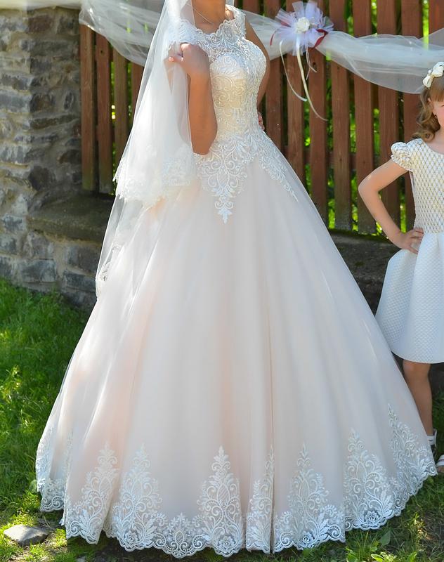 Весільне плаття в ідеальному стані. Верх- корсет, обтягнутий мереживом. Низ - багато шарів підкладки фатіну. Корсет підходить на талію 60-66 см. Ріст -158 см (5-7 см каблук). Колір- пудра #весільнеплаття