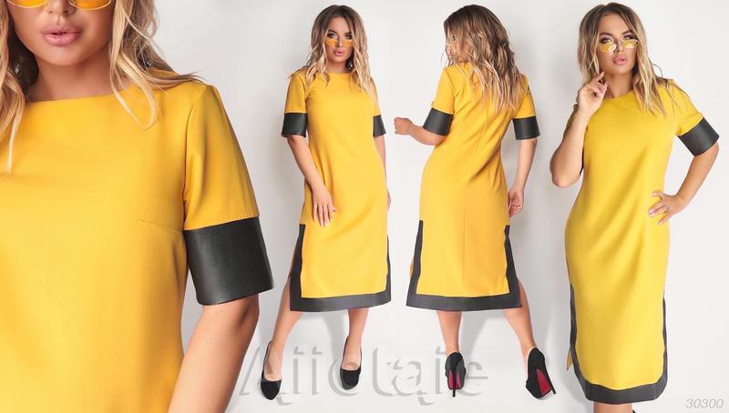 Д. Модель 724 платье Цена: 370 грн. размеры: 48;50;52;54 Дополнительные характеристики длина, см: 119 длина рукава, см: 28 ткань: костюмка, эко-кожа, вдоль спинки потайная молния Цвет- светло розовый; горчица; светло серый Параметры: Размер 48 Объём груди : 102 см Объём бёдер: 112 см Размер 50 Объём груди : 108 см Объём бёдер: 116 см Размер 52 Объём груди : 112 см Объём бёдер: 120 см Размер 54 Объём груди : 116 см Объём бёдер: 124 см