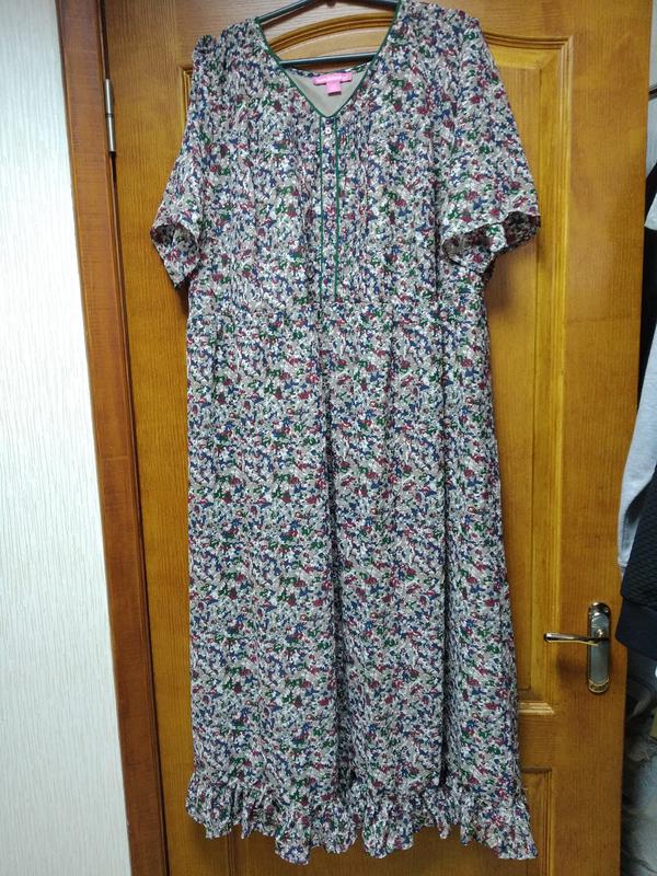 Принтованная платье большого размера.Короткий рукав, талии присборены,Внизу оборка,Талия 130,длина 125.Состояние нового.Без без бумажной этикетки.