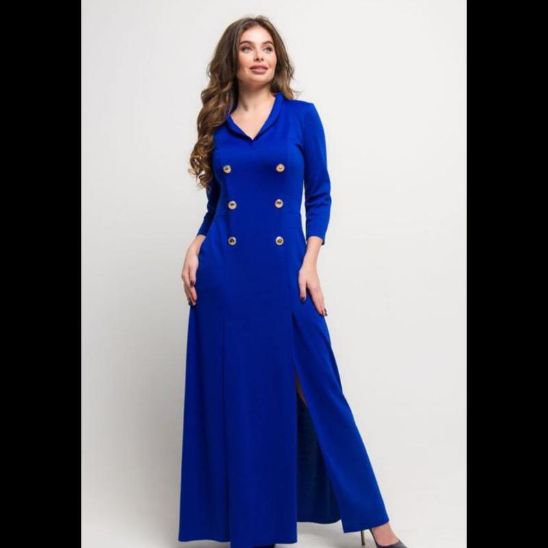 Платье изысканное женское, длинное, элегантное, долгое. Без застежки, от пояса расширена, с карманами и декором пуговицы, юбки вшита на пояс на запах, моя на одну сторону разрез. Легкий трикотаж. В наличии остался размер М, насыщенный синий цвет. Последнее фото таблица замеров.