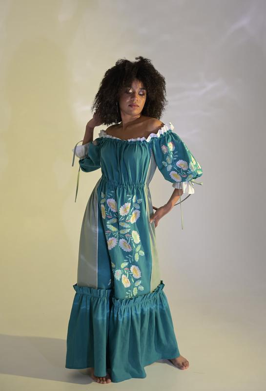 Огромное количество населенных пунктов Украины имеют чрезвычайно глубокую историю, уходя корнями истоков древних культур и закладкой многовековых традиций. Одним из таких мест является поселок Бережанка. У его границ было найдено поселение трипольской и черняховской культур. Наше платье с одноименным названием «Береженка» будто отражает традиции древности и объединяет их с современностью. Классический растительный орнамент удачно сочетается с современным кроем вышитого платья. Платье имеет открытый верх, украшенный белой оборкой, что придает романтичности и игривости образу. Однако длинные рукава и длина изделия уравновешивают открытость и напускают секретность. Платье имеет очень красивый цвет морской волны, который утонченно подчеркнет красоту каждой красавицы.