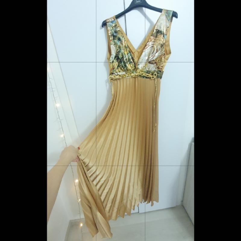 Платье золотистое. Прекрасный вариант для праздников, выпускного. Ткань красиво переливается при ходьбе. Под грудью полуобхват 38 см Полуобхват груди порядка 45-47 Длина платья 147 см В бёдрах свободно На высокую девушку сядет отлично. Сбоку молния, сзади завязываются декоративные кисти. Состояние нового. Возможна примерка в день получения товара при условии доставки за ваш счёт в 2 стороны. Отвечу на все вопросы.
