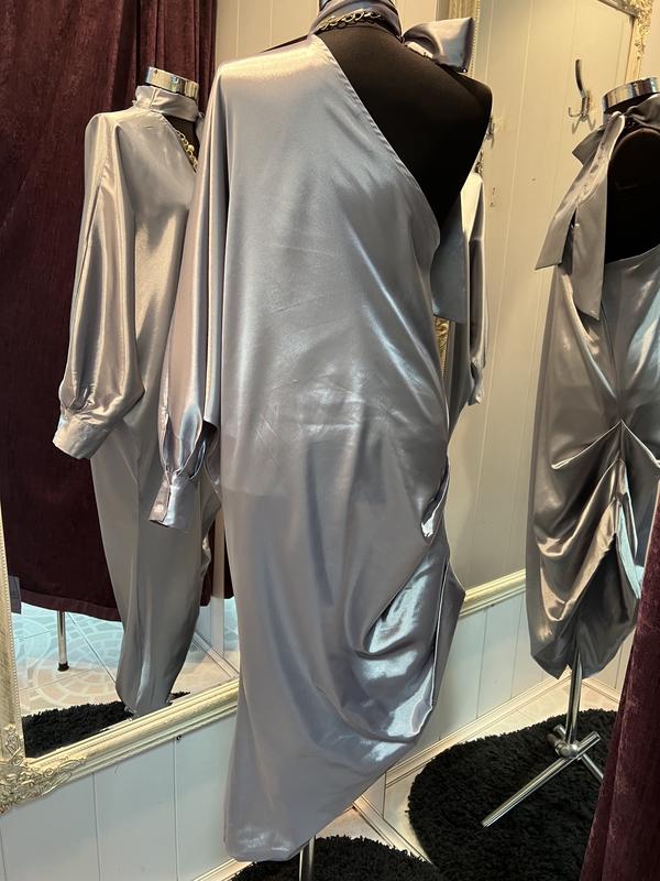 Платье жемчужно серого цвета, рукав реглан, объём груди 55-60, бёдра 53-57, длина изделия 125 по длинной стороне..по стороне с драпировкой 75..(если брать от плеча, как сторона с рукавом)