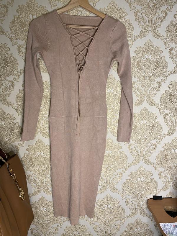 Стильное платье чулок цвет бежевый красивый размер Хс -с-м тянется длинна 101 красиво на груди регулируется шнуровкой