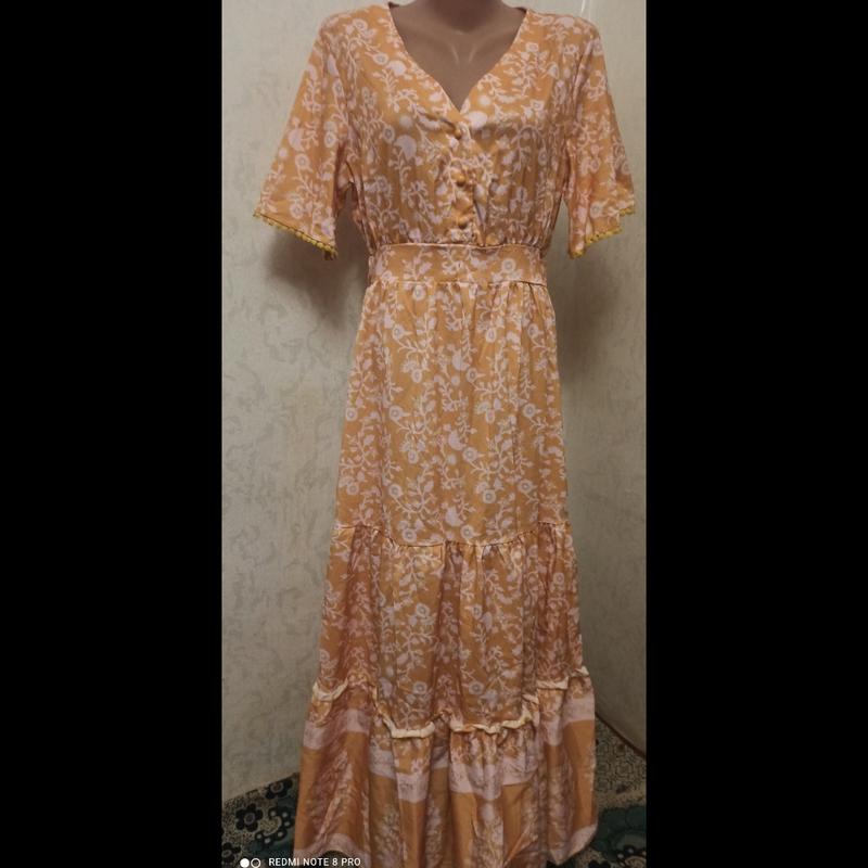 Сукня ярусне з штучного шовку приємного сонячного кольору, ззаду на гумці, рукав трохи розширений, легке, не спекотне, малюнок не нав'язливий. Заміри: довжина-135 см, ОГ-80 см, ширина плечей-39 см, довжина рукава-26,5 див.