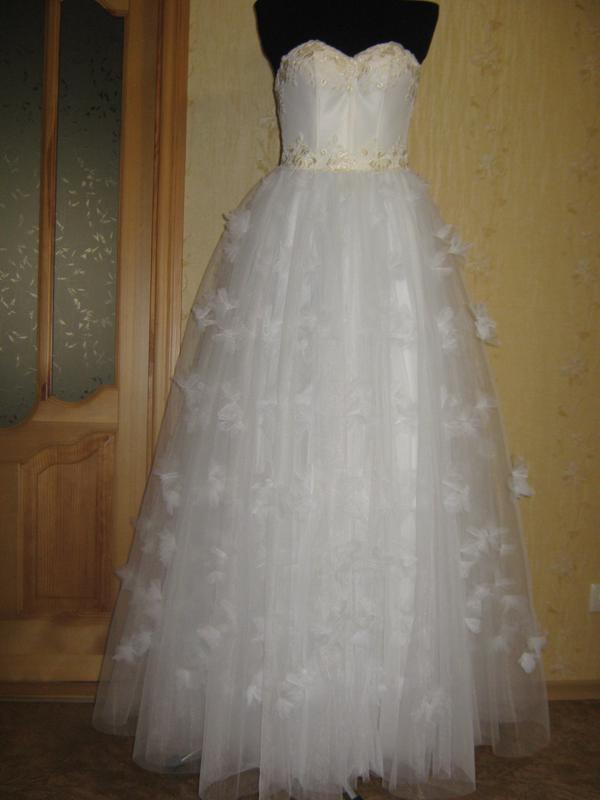 Новое свадебное платье молочного цвета.Корсаж прошит фишбиной(ригиллином), в конструкцию уже вставлены чашки пуш-ап.Расшит вручную отменного качества кружевом,все в меру.Юбки выполнены из легчайшей тонкой евросетки(НЕ ФАТИН!),8 слоёв воздушной ткани создают летящий ,лёгкий и одновременно пышный силуэт.Никаких кринолинов с кольцами, ничего общего с "бабой на чайник" -пышность именно за счёт количества ткани.Высочайший уровень евро обработки,закрытые швы,окантовка. Размер S(42-44 украинский). Платье отшито для продажи,также отшиваю свадебные платья любой сложности на заказ.Торгуюсь-реальной покупательнице очень хорошая скидка.