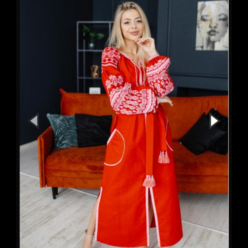 Вышитое женское платье на домоткой ткани. Размер 50/52 (XL) Ог. 120см, От. 115см, Про 124см. В наличии на красной и на желтой натуральной ткани. Состав ткани: 49% лен, 30% хлопок, 30% вискоза.