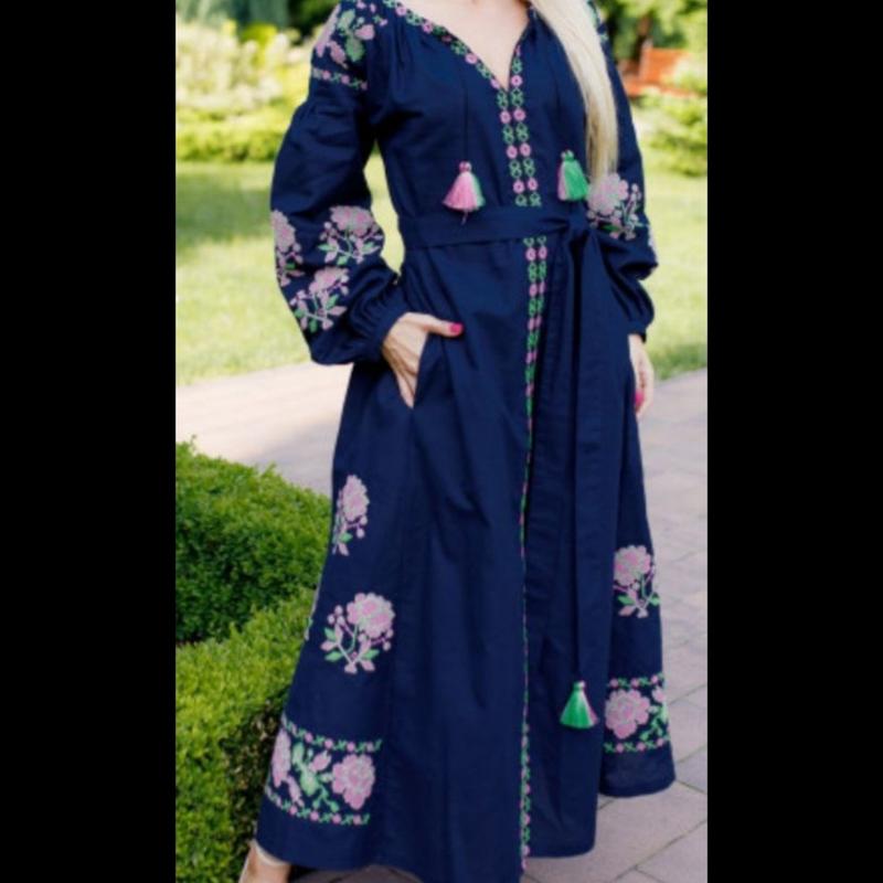 Довга вишита жіноча сукня на синій домотканій тканині.