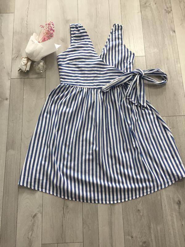 Плаття біло-синє в полосочку Mango Розмір - L Довжина - 102 см. ; Груди - 45,5 см. ; Талія - 41 см. Присутній нюанс(и) - жовті міні плями