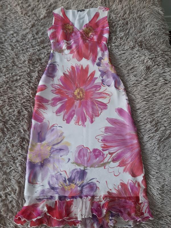 гарне шовкове плаття, тягнеться, з підкладом, з боку блискавка. Розмір вказан 34 но краще на 36-38. Довжина 130 см