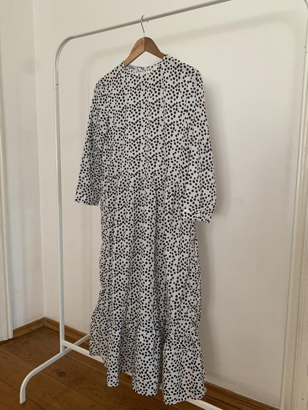 В наявності чудова легка сукня Стан ідеальний, була вдягнута 1 раз на фотосесію Розмір не вказано, але так як вона оверзайз, підійде на Хс-М Ідеально на зріст від 165 см Довжина по спинці - 120 см Плечі - 39 см Пог - 51 см Рукав 3/4 Така сама сукня, лише з іншим принтом коштує 1500 грн.
