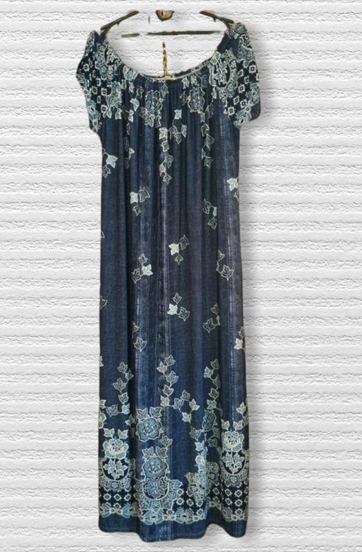 Очень классное удобное платье из струящейся эластичной ткани, похожей на масло. Расцветка под джинс. Замечательно тянется. По горловине резинка. Свободный фасон. Новое без бумажной бирки. ПОГ-57+ ПОТ-57+ ПОБ-65+ Длина-128