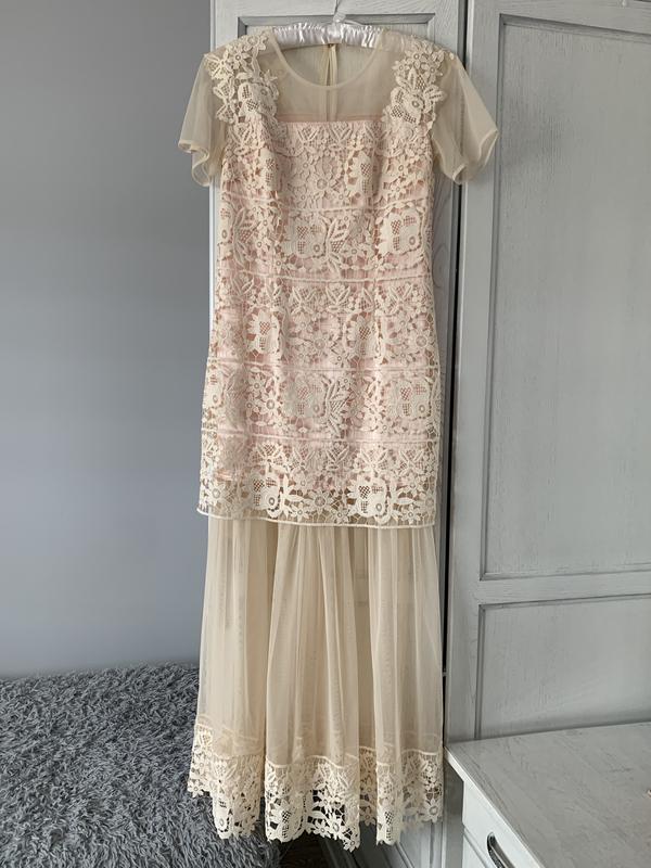 Заміри: пог 43, пот 43, поб 46. Плаття іде пряме, знизу відщіплюється і робиться коротшим. Довжина максі плаття 140 см, короткого 79 см. В ідеальному стані, носилася декілька разів