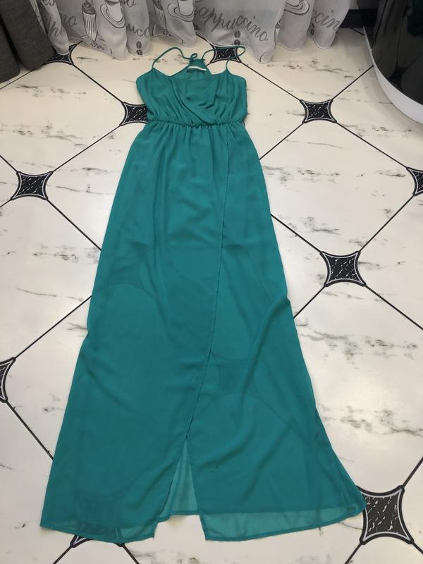 Сукня від Zara зеленого кольору з розрізом спереду. В ідеальному стані, але є невеликий нюанс, дивись на останньому фото. Заміри виробу: ПОГ 40 см,талія на резинці тягнеться до 47 см, довжина виробу 137 см