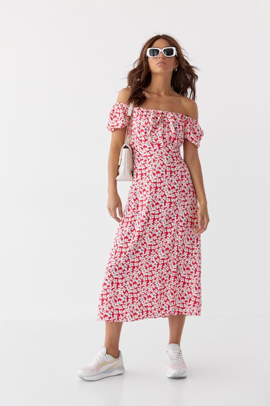 Модний фасон, приємна на дотик тканина і красиве квіткове забарвлення - в цю сукню ти закохаєшся з першої ж примірки. У неї короткі рукави внизу і вгорі зібрані на вузьку гумку, що дозволяє закривати або оголювати плечі. Краї низу прямі, відрізна лінія талії без гумки. Верхня частина виробу має розріз із зав'язками по центру. Спинка виробу від талії повністю зібрана на безліч тоненьких резиночок. Ти закохаєшся в м'яку тканину і вільний фасон цієї новинки, швидше вибирай своє ідеальне забарвлення і замовляй модну сукню в інтернет-магазині La Princesse