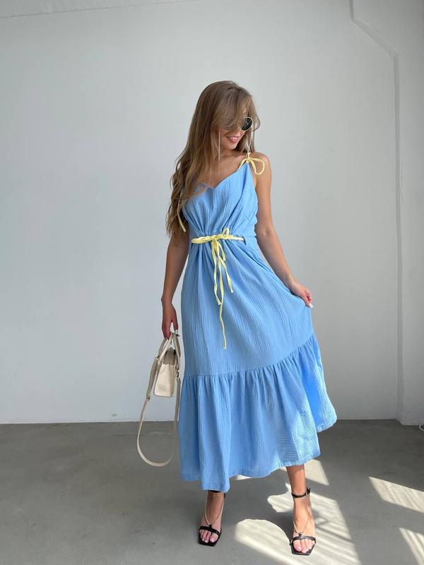 Сукня довга. Вільного крою, легка на регулюючих бретелях, також можна регулювати зав'язки на талії.♡ Мод.049 (gr) Розмір: 42-44, 46-48 Тканина: муслін Колір: жовтий, блакитний, малина, трава По всім питанням пишіть в чат сайту.