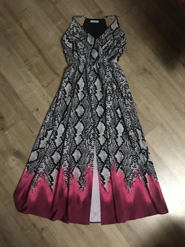 Красивое, эффектное, легкое платье в пол, впереди до колена разрез, талия присобрана резинкой, длина от талии 102 см, бретельки регулируется.