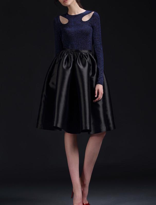 Платье Isabel Garcia, размер ХS-S (обхват груди 82-87см; обхват талии 63-67см). Было надето один раз на мероприятие. Лаконичное платье миди, с облегающим топом и пышной одноярусной юбкой, где топ с длинным рукавами выполнен из эластичной ткани с синим люрексом и сетки, а юбка от талии из мягкой, но формоустойчивой ткани черного цвета. Покупала на фигуру: рост – 165см, объем груди - 84см, объем талии – 62см, объем бедер -92см.