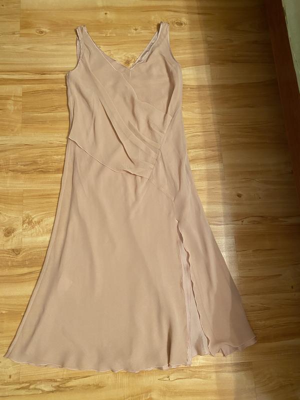 Сліп-сукня з легкого шифону, воно ніжне і не вагоме, підкладка під шовк. Виробник Італія. Дуже цікава модель, класно і дорого виглядає на тілі. Зпереду має розпірку. Розмір 12/14. Пог 49 см, пот 47-48 см, поб- 55 см. Довжина плаття 118-119 см. Стан нового, ідеальний.