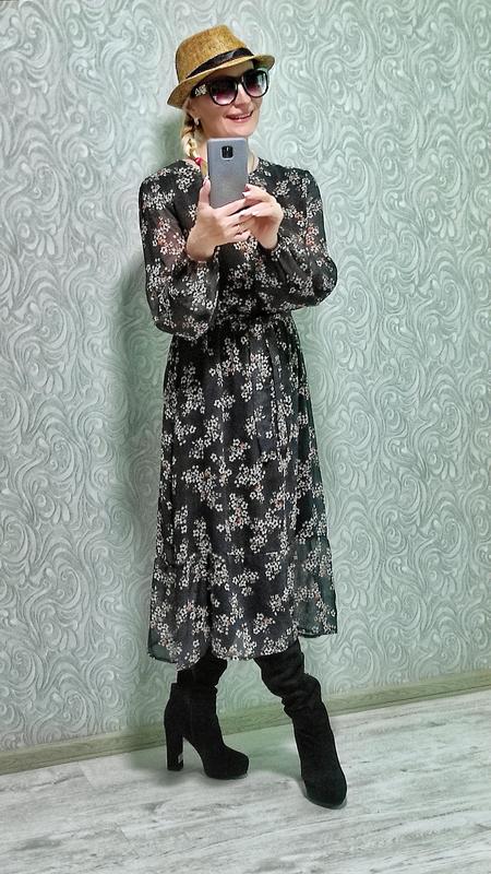 Легка, повітряна шифонова сукня стане родзинкою твого гардеробу. Сукня з довгим рукавом, застібка ззаду на гудзик. Сукня відрізна по лінії талії, під пояс.