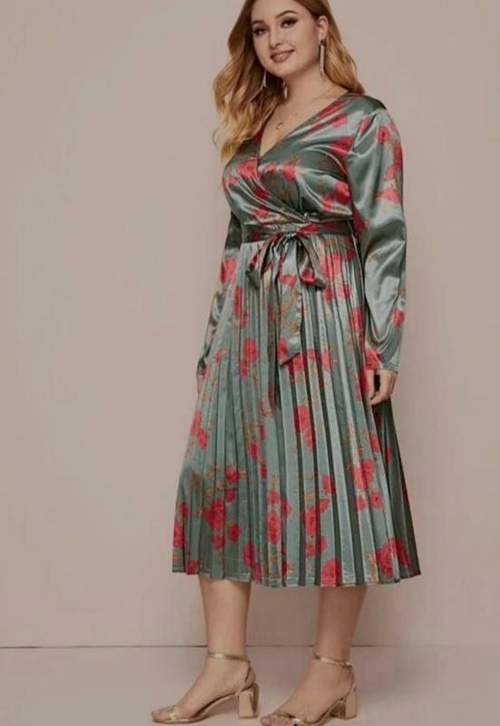 Сукня сукня міді на запах, плісе зелене/оливкову з принтом,52-54