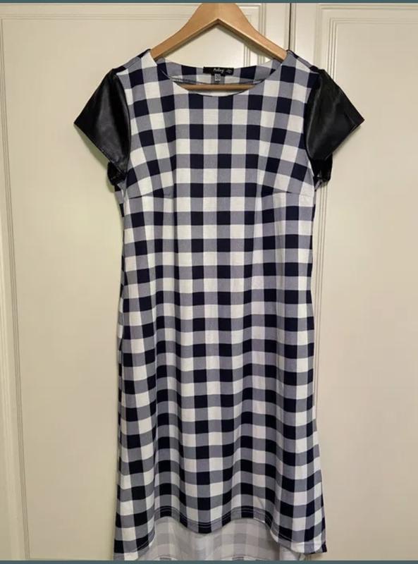 Платье с интересным дизайном, спереди чуть выше колен (на рост 173см), сзади чуть длинее с закруглённым низом, клетка темно - синяя, рукав под искусственную кожу. Немного оверзайз. в отличном состоянии!