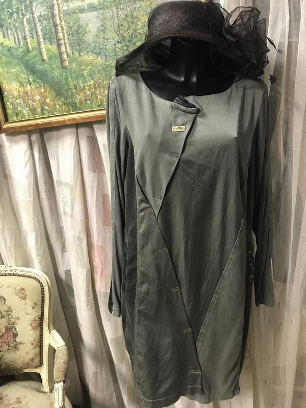 Шикарное платье от Elisa Canaletti. Дизайнерская модель, комбинация тканей разных структур одного цаета(оливковый). Длинный трикотажный рукав, два кармана, ассиметричная. Состав:коттон/эластан. . Шикарный декор.Размер по бирке Lx Замеры:длина-92 см, ПОГ-50 см, ПОБ-51 см, рукав-63 см.