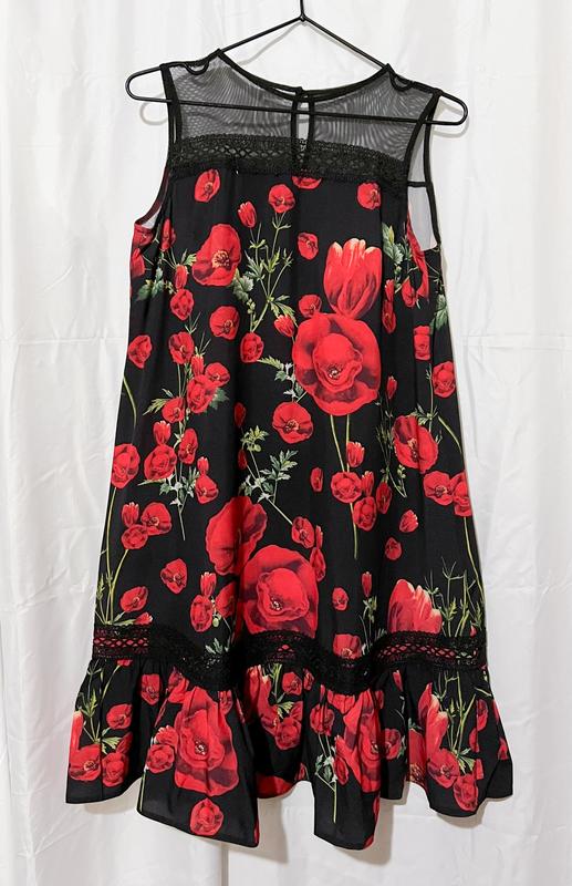 Легкое просторное черное платье с красными маками, с кружевом и сеточкой. Есть застежка сверху спинки. Бренд Modus