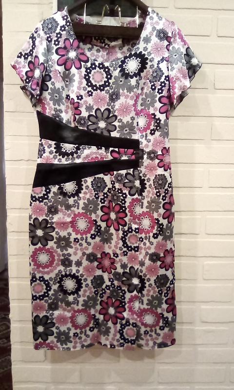 Легка сукня. Застібається на блискавку збоку. По переду з лівого боку розріз-шлиця. Розмір 48 -50. Заміри: напівоб'єм грудей 50 см, напівоб'єм талії 43 см, напівоб'єм стегон 52 см. Довжина сукні 101 см. На платті є нюанси - нижня чорна вставка трохи закошлатилась, а під верхньою вставкою невеличка дірочка.