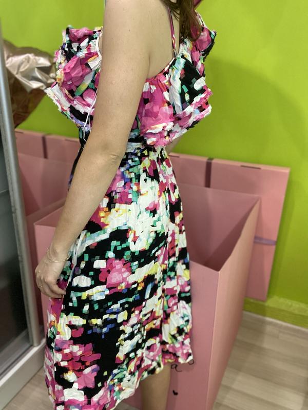 Принтована міді-сукня H&M ззаду довша, спереду коротша, на одне плечико (інше на бретельці) з резинкою на талії. В ідеальному стані, легенька тканина. Розмір EUR 42/ US 12, 100% віскоза.