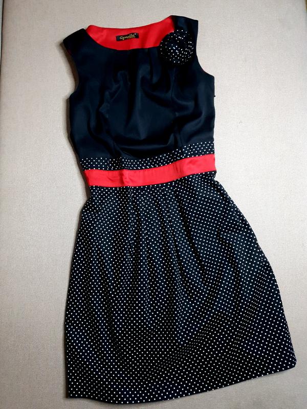 Чорна сукня в білий горошок з червоними акцентами застібається з лівої сторони на приховану блискавку