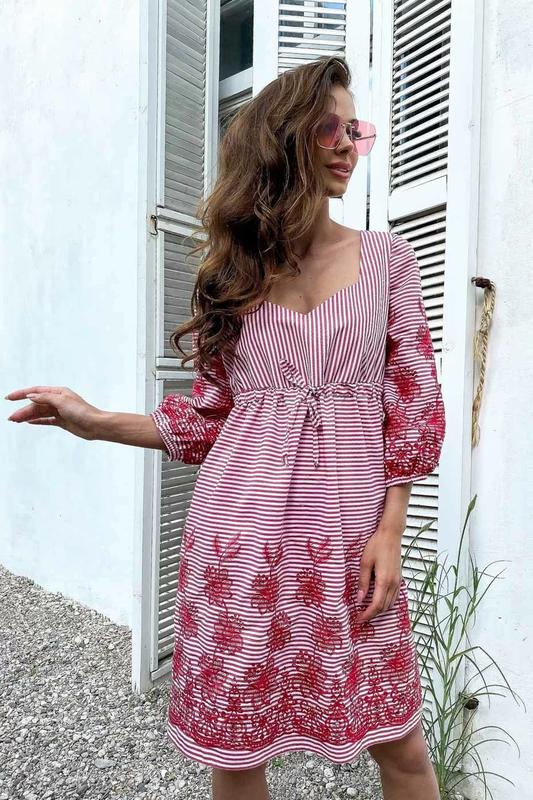 Параметри: Довжина виробу від верхньої точки плеча: S-M=89 см, L-XL=90 см Довжина рукава: S-M=46 см, L-XL=47,5 см Тих. опис: Артикул: 1724.4702 Колекція: Welcome to summer Категорія: гламурні / повсякденні / міські/вуличні Сезон: літо Фасон: прямий / вільний / із завищеною талією Матеріал: бавовна з вишивкою Колір: червоний Декоративні елементи: вишивка на рукавах і внизу вироби, куліса, низ рукава на гумці 1 см Горловина: каре Вид рукава: 3/4, втачной, пишний рукав Конструктивні елементи: підріз під грудьми, куліса Комплектація: сукня Догляд за речами: ручне прання 30° Зверніть увагу!: Колір виробу може відрізнятися, враховуйте передачу кольору камери і монітора. Принт: з вишивкою