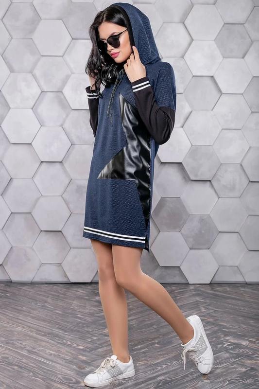 Параметри: Довжина виробу від верхньої точки плеча: S=87 см, M=88 см, L=88,5 см, XL=90 см Довжина рукава від горловини: S=65 см, M=65,5 см, L=66 см, XL=66,5 см Тих. описание: Артикул: 1090.3152 Коллекция: Freedom of life Категория: кэжуал / молодежные / спортивные / повседневные / городские/уличные Сезон: весна / осень-зима / демисезон Фасон: прямой / платье футляр / платье туника / свободный Материал: двунитка, джерси, эко-кожа Цвет: синий Декоративные элементы: "кожаная" звезда-нашивка, капюшон, лента по низу изделия и рукава Фурнитура: лента в черно-белую полосу Горловина: круглая с капюшоном Вид рукава: длинный, приспущенный Конструктивные элементы: разрез внизу изделия по боковым швам, спущенное плечо Комплектация: платье Уход за вещами: ручная стирка до 30° Внимание!: В модели нашивка в форме звезды расположена с правой стороны. Обратите внимание!: Цвет изделия может отличаться, учитывайте цветопередачу камеры и монитора. Принт: принт