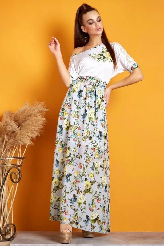 Нежное летнее платье, выполненное в простом, лаконичном дизайне с акцентом на талии и вырезом «лодочка». Однотонный верх платья идеально сочетается с цветочным рисунком юбки и позволяет использовать самые разнообразные аксессуары. Материал: креп-шифон, микромасло, кружевной гипюр Длина изделия: 150 см Цвет: серый принт, белый