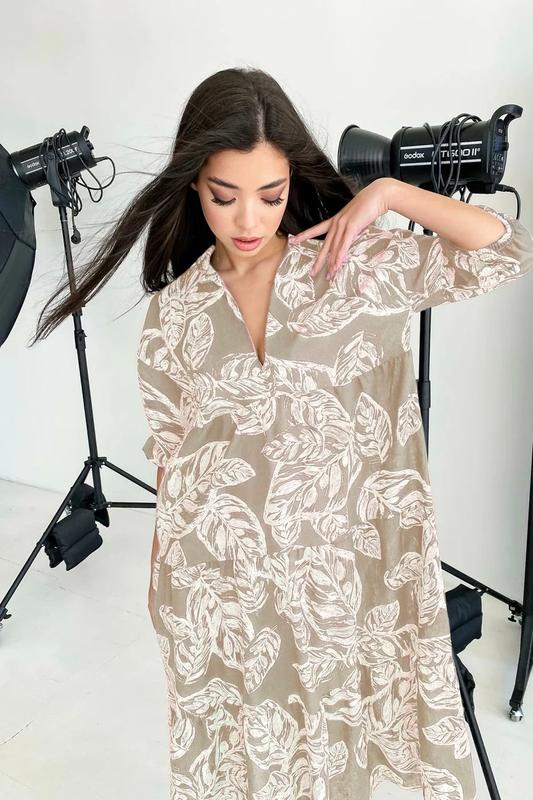 Параметри: Довжина виробу від верхньої точки плеча: S-M=118,5 см, L-XL=120 см Довжина рукава від горловини: S-M=49,5 см, L-XL=52 см Тих. описание: Артикул: 1753.5160 Коллекция: Summer mix Категория: гламурные / повседневные / городские/уличные / элегантные / нарядные/праздничные Сезон: лето Фасон: свободный / расклешенный / с пышной юбкой Материал: принтованный лен Цвет: кофе с белыми цветами Декоративные элементы: Три яруса рюши, v-образный вырез Горловина: отложной воротник Вид рукава: 3/4, приспущенный, пышный рукав Конструктивные элементы: спущенное плечо Комплектация: платье Уход за вещами: ручная стирка до 30° Обратите внимание!: Колір виробу може відрізнятися, враховуйте передачу кольору камери і монітора. Принт: квітковий принт